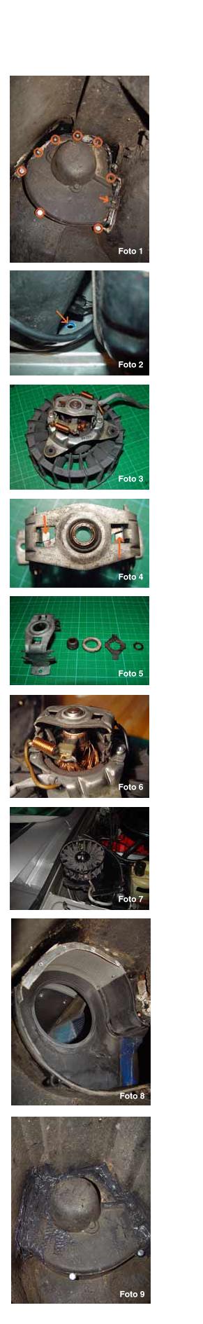 Frischer Wind im Innenraum Der Lüftungsmotor meines CD´s quälte sich schon seit einigen Jahren. Um ihn überhaupt in Rotation zu versetzen, musste ich regelmäßig zunächst auf höchste Stufe schalten damit er anlief. Wenn ich anschließend auf eine niedrigere Stufe geschaltet habe, lief er normal. Da ich ahnte, dass der Ausbau und die Reparatur des Lüfter nicht mal eben gemacht ist, habe ich mich mit ihm auf diese Weise arrangiert. Doch jetzt war er es anscheinend leid. Mit einem lauten Kreischen verabschiedete er sich endgültig und war nicht mehr zu bewegen auch nur ein laues Lüftchen ins Wageninnere zu blasen. Damit er nun nicht im Stand durchbrennt und damit definitiv ein Ersatzmotor fällig wird, musste der Motor raus und die Lager neu gefettet werden. Was möglicherweise nicht jedem CD Eigner bekannt ist, sobald die Zündung eingeschaltet ist, die läuft Lüftung, auch wenn der Gebläseschalter auf Aus steht!!! Lediglich wenn man den Lüftungshebel ganz nach links schiebt, bleibt der Lüftermotor stehen. So kann also jeder CD-Fahrer leicht testen, ob seine Lüftung noch leichtgängig läuft. Man stelle sich an einen ruhigen Ort, z.B. Garage, schaltet das Gebläse auf Aus, stellt die Lüftung auf die seitlichen Düsen und schaltet die Zündung ein. Nach einigen Sekunden ist ein leises Surren zu hören (sehr leise). Sollte es ausbleiben, kann man mit einer Feuerzeugflamme in der Nähe der Lüftungsdüsen testen, ob dort ein ganz leichter Wind weht. Sollte sowohl Geräusch, als auch der Wind ausbleiben, deutet dies auf einen bereits sehr schwergängigen Lüftermotor hin. Wenn dieser trotz anliegendem Strom sich nicht dreht, brennt er irgendwann durch. Das einzige was dem Motor dann fehlt ist etwas Lagerfett. Leider ist es dazu notwendig das Lüftergehäuse auszubauen und den Motor zu zerlegen. Also, für alle CD-Fahrer, die irgendwann das gleiche Problem ereilt, hier ein paar Tipps zur Reparatur, die ca. 3 Std. dauert. Nur keine Angst, von Elektrik braucht man dazu keinerlei Schimmer haben. Lediglich etwas handwerkliches Geschick und einwenig gelenkig sollte man sein. Denn der Ausbau des Lüftermotors erfolgt wiedererwartend unter dem rechten, vorderen Kotflügel. Die Technik ist identisch mit der des Diplo. bzw. Admiral. Allerdings hat man das Gehäuse umgebaut, um die gesamte Lüftung unter den engeren Kotflügeln des BITTER CD unterzubringen. Im Werkstattbuch des Diplo. Ist leider nur der Ausbau der gesamten Lüftung beschrieben jedoch nicht der des Lüfters. Zunächst das Auto vorne rechts mit dem Wagenheber anheben. Wer viel Platz braucht, sollte das Rad abmontieren. Bei mir gings auch ohne Demontage. Unter dem Kotflügel sieht man nun ein Gehäuse mit einer runden erhabenen Dose. (Foto 1, ist nach dem Wiedereinbau entstanden) Das ist er, der Lüftermotor. Am unteren Rand des Gehäuses sieht man bereits einige Befestigungsschrauben. Die restlichen Schrauben befinden sich unter der Dichtungsmasse am Übergang zum Kotflügel. Diese muss komplett mit einem Schraubenzieher entfernt werden um an die Schrauben zu gelangen. Dabei bietet es sich an vor dem Wiedereinbau des Lüfters hier Rostvorsorge zu betreiben. Insgesamt ist der Lüfter mit 8 Schrauben am Gehäuse, und einer Blechschraube am Kotflügel befestigt. Die unteren 3 Schrauben und die Schraube direkt über dem Einlass zur Stehwand rechts, sind Maschinenschrauben des original Diplogehäuses Auf der Rückseite sind leider nur Gewindebuchsen ins Kunststoffgehäuse eingelassen. Diese drehen sich sofort mit, wenn die Schrauben etwas fest sitzen. Hier kann man davon ausgehen, dass sie festgerostet sind, und setzt gleich die Bohrmaschine an. Die restlichen 4 Schrauben sind Blechschrauben, aufgrund des Umbaus der Heizungsanlage. Eine weitere Schraube wird im Motorraum, zwischen Ausgleichsbehälter und Heizung demontiert (Foto 2). Dort kann man gleich den schwarzen Stecker aus der Heizung ziehen und ebenfalls den weißen, zweipoligen Stecker, der damit verbunden ist. Dieser ist der direkte Anschluss des Lüftermotors und muss mit ausgebaut werden. Hierzu den Stecker mit der Gummitülle ins Innere des Heizundgehäuses drücken. Nun kann man den Deckel mit dem Lüftermotor vom Heizungsgehäuse abziehen und unter dem Kotflügel herausnehmen. Als nächstes den Motor mit Lüfterrad vom Gehäuse schrauben. Hierzu die drei Befestigungsschrauben durch das Lüfterrad lösen. Wenn man den Motor nun in der Hand hält und das Lüfterrad dreht, stellt man bereits fest, ob der Motor leichtgängig ist (Foto 3, Motor mit Lüfterrad). Meistens ist das Lager am Kollektor trocken. Um es dauerhaft zu fetten hilft hier kein Öl, sondern nur ein hitzebeständiges Lagerfett. Um dies auf die Motorwelle zu bringen, muss der Lagerbock entfernt werden. Hierzu die beiden Kreuzschrauben entfernen und den Lagerbock mit den Kohlen abheben. Bei meinem Lüfter war das Lager auf der Welle festgefressen und ich musste zunächst die Haltefeder des Lagers lösen, um den Lagerbock ohne Lager entfernen zu können. Hierzu die Haltefeder mit einem kleinen Schraubenzieher verdrehen, bis sie sich von den Auflagenasen löst (Foto 4). Achtung!!! Beim Zerlegen auf die Reihenfolge der Teile auf der Motorwelle achten (Foto 5). Sollte das Gleitlager auf der Welle festsitzen, kann man es mit einer Zange vorsichtig von der Welle ziehen. Dabei nicht zu fest drücken, da das Lager aus einem Weichmetall besteht. >> Ach ja, sollte sich herausstellen, dass das andere Motorlager defekt ist, ist es wahrscheinlich günstiger sich einen Ersatzmotor zu besorgen. Denn zur Reparatur muss das Lüfterrad abgezogen werden. Beim Zusammenbau wird es dann nicht mehr rund laufen und das Gebläse wird ziemlich laut und Vibrationen von sich geben. << Nach der Demontage sollten alle Teile gereinigt werden. Die Rückstände auf der Motorwelle kann man mit Benzin abwaschen. Härtere Spuren mit 1200er Schleifpapier entfernen. Die Fraßspuren im Inneren des Lagers ebenfalls mit einem gerollten Stück Sc